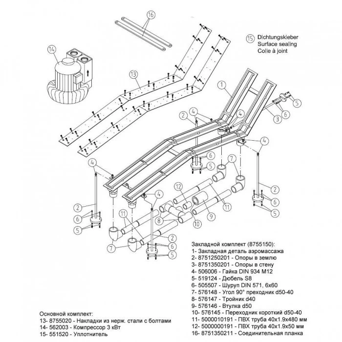 Насосный комлект для трехместного аэромассажного лежака Hugo Lahme. Включает в себя пластины под форсунки, выполненные из нержавеющей стали AISI-316L, а также воздушный компрессор мощностью 3 кВт с трехфазным напряжением, шумогаситель и фитинги.