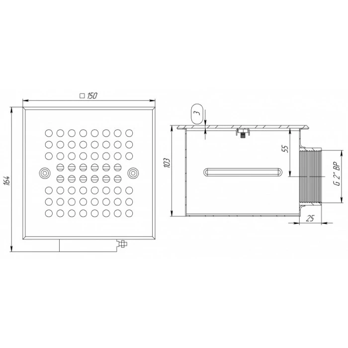 Донный слив 2″ 150х150, плитка (AISI 316L), АС
