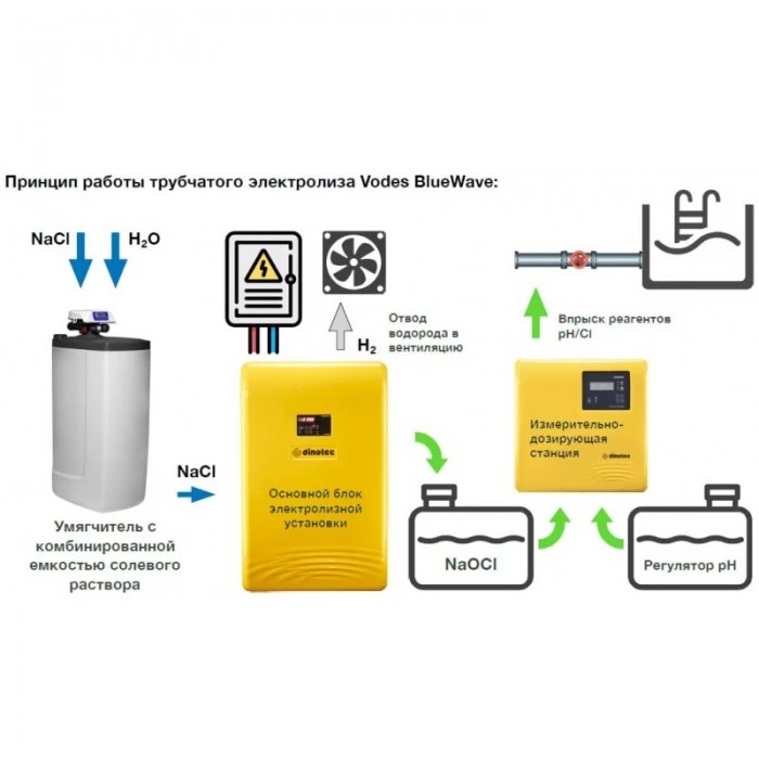 Установка электролиза VoDes BlueWave представляет собой станцию по производству гипохлорита натрия посредством химической реакции в солевом растворе под действием электрического тока в трубчато-ячеистой ячейке. Цифровой контроллер с дисплеем управляет химической реакцией, приготовлением и подачей солевого раствора и умягченной воды, отводом водорода, образующегося при реакции. Цифровой контроллер оснащен интерфейсом для подключения дополнительной станции дозирования полученного в результате электролиза раствора гипохлорита натрия, что делает систему, в комплексе, полноценной станцией по производству и дозированию дезинфицирующего раствора непосредственно в воду бассейна. Все элементы, включая контроллер, ячейку электролиза, сепаратор газообразного водорода, перистальтического насоса подачи солевого раствора, необходимой арматуры из химически стойкого PVC, расположены на единой панели, устанавливаемой на стену технического помещения с предусмотренной обязательной вентиляцией и отводом водорода.