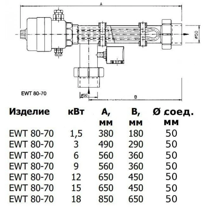 Электронагреватель EWT 80-70 6 кВт,380 В, (1½»), со встроенным термостатом и датчиком давления