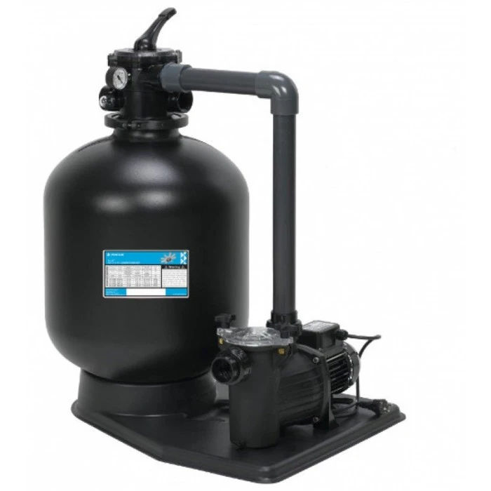 Фильтровальная установка оснащена: платформой, песочным фильтром, насосом производительностью 6 м3/час, 6-ти позиционным клапаном, манометром и комплектом фитинга для соединения.