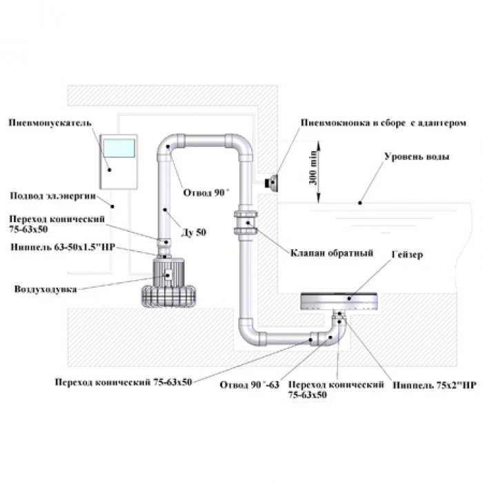 Гейзер, или аэромассаж для бассейна, представляет собой стальное решетчатое плато. Изделие служит для генерации большого количества пузырьков воздуха. Гейзер рассеивает нагнетаемый воздух, в результате чего образуется множество пузырьков, делающих массажный эффект более мягким. Они поднимаются из толщи воды и создают эффект бурления.