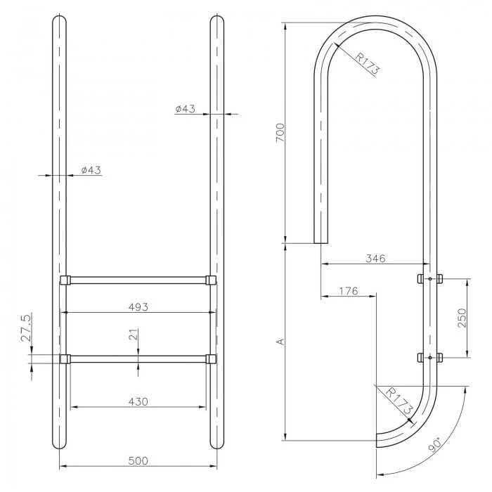 Лестница Kripsol MURO - с поручнями из полированной нержавеющей стали. Состоит из четырех ступенек с противоскользящими накладками. Лестница предназначена для бассейнов с узким бортом. Поручни крепятся к бортику бассейна. Нижняя часть лестницы упирается в стену бассейна. Ступени крепятся к поручням с помощью болтов.