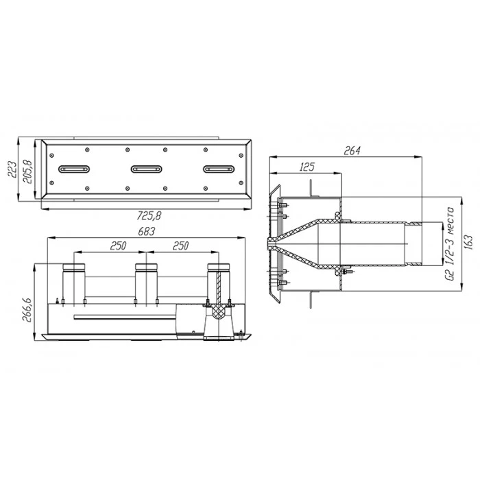Габаритные размеры: лицевая панель ‒ 725,8х205,8 мм, общие ‒ 725,8х266,6х223 мм;