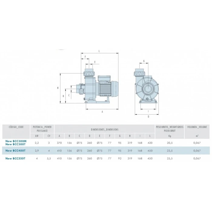 Самовсасывающий насос New BCC для бассейнов без фильтра предварительной очистки. Корпус насоса изготовлен из полипропилена армированного стекловолокном. Частота вращения – 3000 оборотов в минуту. Насос идеально подходит для применения в контуре систем аттракционов. Вал изготовлен из нержавеющей стали AISI 316-L. Защита двигателя IP-55.