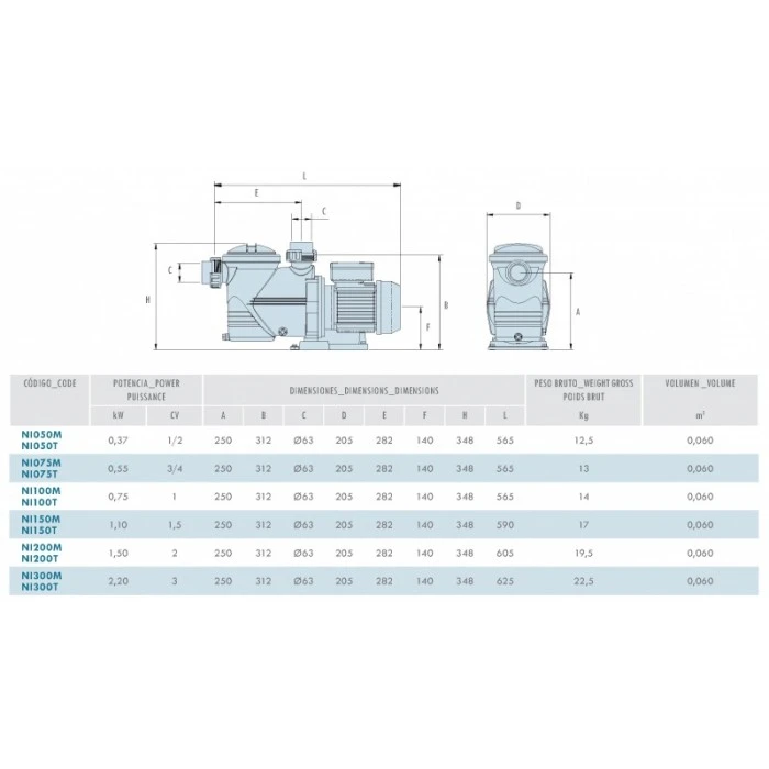 Самовсасывающий электронасос Niagara для бассейнов, со встроенным фильтром предварительной очистки большой емкости. Крышка фильтра предварительной очистки изготовлена из прозрачного поликарбоната. Корпус насоса изготовлен из полипропилена армированного стекловолокном и устойчив к воздействию химических реагентов используемых для дезинфекции бассейна. Вал изготовлен из нержавеющей стали AISI 316-L. Защита двигателя IP-55.