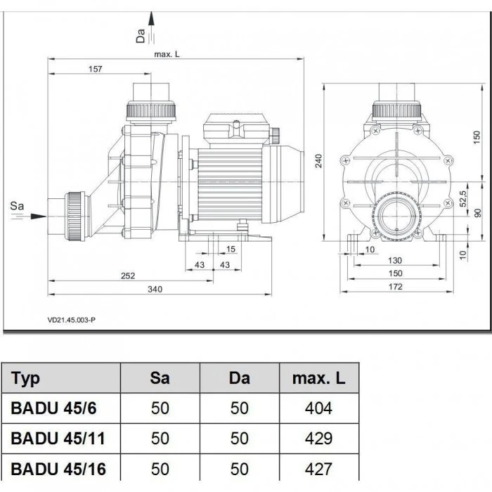 Нормальновсасывающие циркуляционные насосы BADU 45 в виде моноблока с интегрированным устройством самодренажа. Рассчитан на обслуживание гидромассажных установок в плавательных бассейнах и СПА. Насос блочного типа, торцевое уплотнение находится на пластиковом носике рабочего колеса. Вал электромотора не соприкасается с водой бассейна! Дополнительная электрическая изоляция.