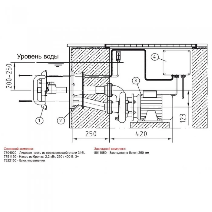 Комплект с пневмоуправлением и прямоугольной лицевой панелью из полированной нержавеющей стали V4A. В данный комплект противотока входит:  насос, трубопроводная арматура, пневмоуправление и лицевая панель. На изображении показан полный комплект с закладной, поручнем и опорой насоса (которые приобретаются отдельно).