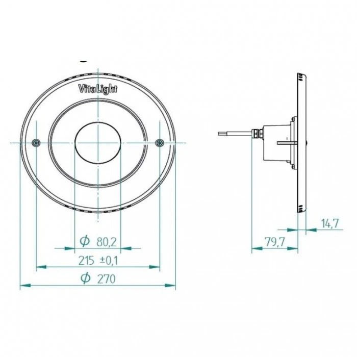 Светодиодный прожектор VitaLight (Hugo Lahme) 16/4 Power LED 3.0, 43 Вт, 24В DC, круг 270 мм, V4A, монох. 3000K, 5 м каб. 2x1,5 мм2, BZ - используется для освещения бассейнов. Может быть установлен в следующие типы бассейнов с соленой водой: