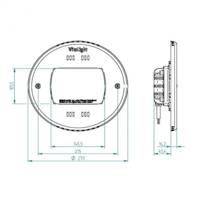 Светодиодный прожектор VitaLight (Hugo Lahme) 28/4 Power LED 3.0, 80 Вт, 24В DC, круг 270 мм, V4A, RGBW, 5 м кабель 2x1,5 мм2, V4A - используется для освещения бассейнов. Может быть установлен в следующие типы бассейнов с пресной водой: