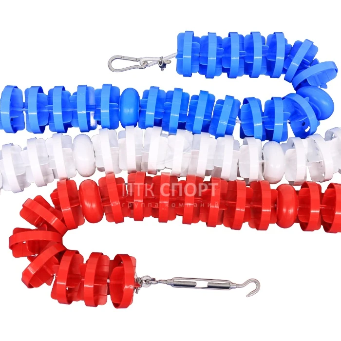 Разделительная дорожка без троса и креплений  (не входят в комплект поставки). Разделительные дорожки необходимы для проведения соревнований по плаванию. Поставляются для бассейнов 25 м и 50 м, а также бассейнов нестандартной длины. Разделители дорожек могут иметь волногасители диаметром от 105 мм до 150 мм. Канаты протягиваются по всей длине бассейна и закрепляются на обеих торцевых стенках бассейна, для этого в них должны быть вмонтированы анкерные крепления.