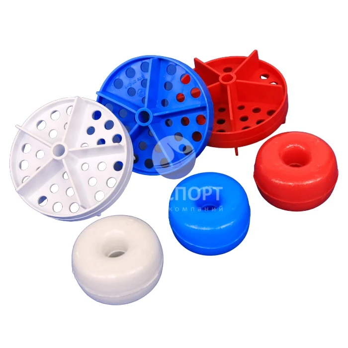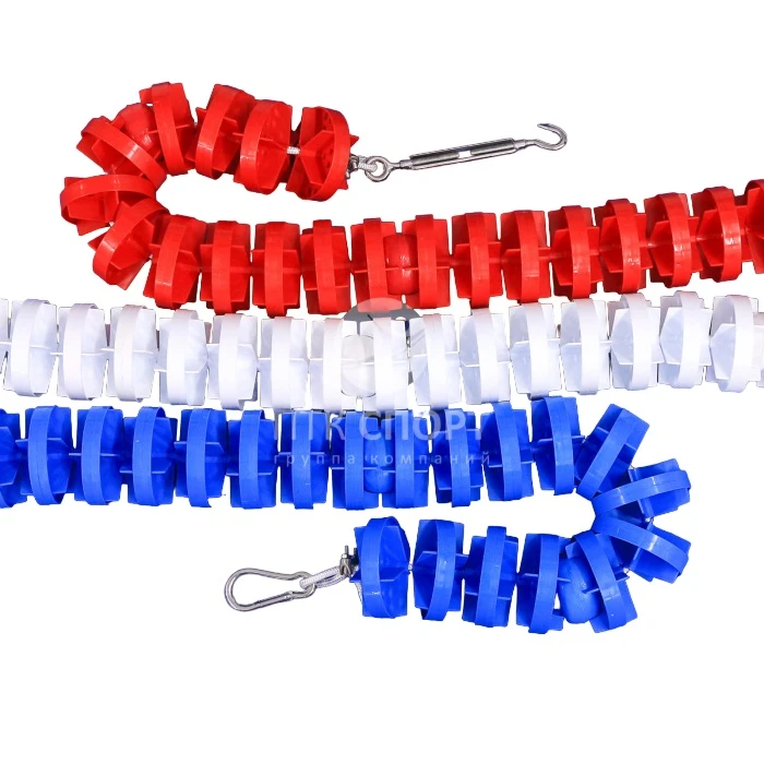 Разделительная дорожка без троса и креплений (не входят в комплект поставки). Разделительные дорожки необходимы для проведения соревнований по плаванию. Поставляются для бассейнов 25 м и 50 м, а также бассейнов нестандартной длины. Разделители дорожек могут иметь волногасители диаметром от 105 мм до 150 мм. Канаты протягиваются по всей длине бассейна и закрепляются на обеих торцевых стенках бассейна, для этого в них должны быть вмонтированы анкерные крепления.