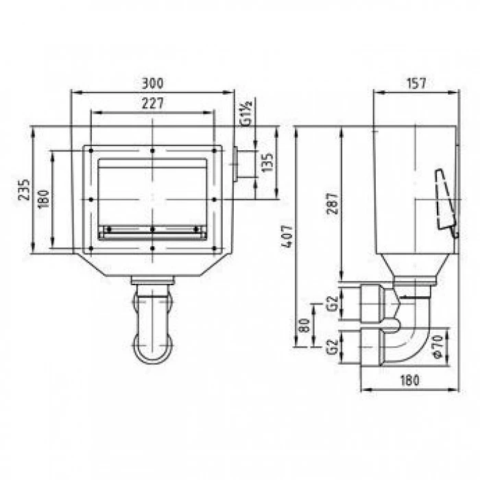 Имеет два выхода (вынутренняя резьба 2"). В корпус также встроено дополнительное подключение в боковой части для дренажа с внутренней резьбой 1 1/2’’. Рамка из нержавеющей стали в комплект не входит.
