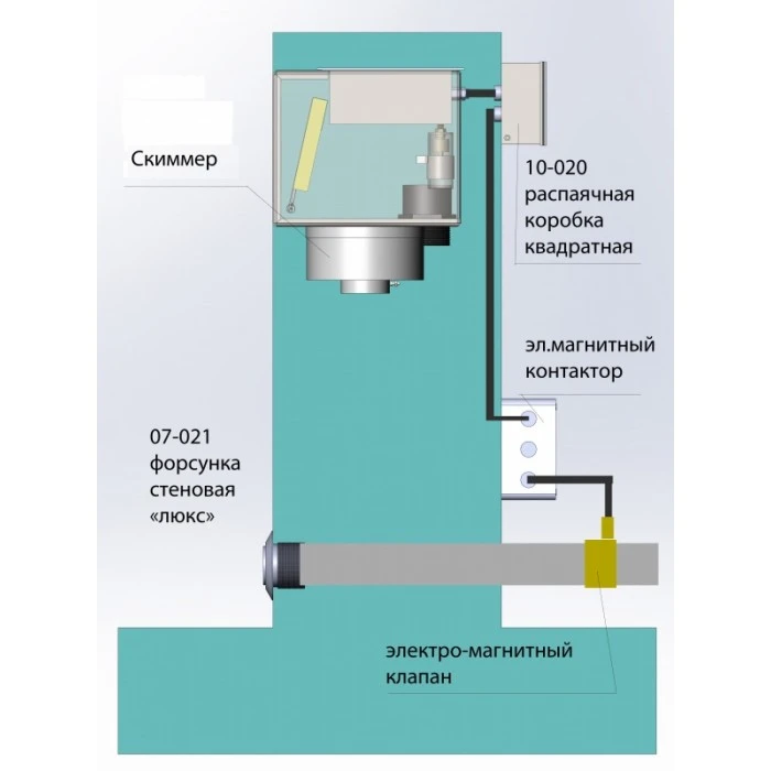 Скиммер служит для забора верхнего слоя воды, подачи ее к фильтровальной установке и последующей очистки.