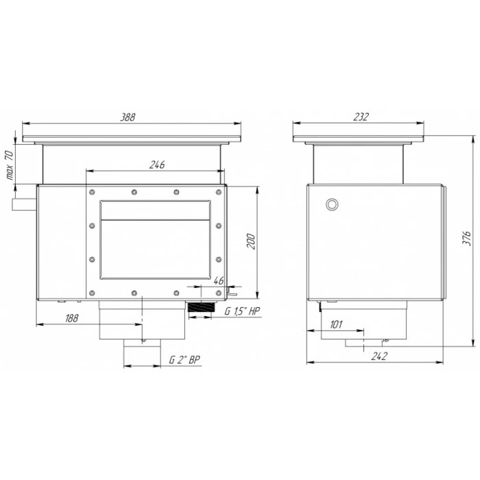 Подсоединение к фильтру - внутренняя резьба 2’’, к аварийному переливу - наружная резьба 1,5", к трубопроводу автодолива - наружная резьба 1/2".