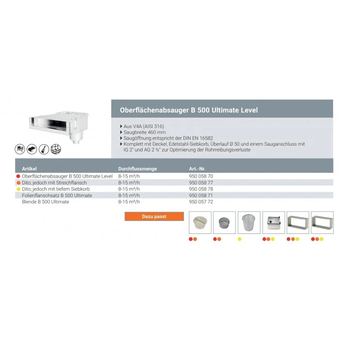 Скиммер В500 ULTIMATE от компании Behncke предназначен для бетонных бассейнов. Изготовлен из нержавеющей стали AISI-316. Оснащен фильтром грубой очистки. В режиме рециркуляции насос через скиммер из бассейна всасывает воду, которая попадает в фильтр и после обработки через форсунку возвращается в бассейн. В комплекте с крышкой, сетчатым фильтром из нержавеющей стали, переливом d50 и всасывающим патрубком 2" и 2½". Особенностью данного сверхтонкого дизайнерского скиммера является отсутвие верхний крышки рамки скиммера, что позволяет установить скиммер вплотную к борту бассейна и максимально повысить уровень воды в бассейне.