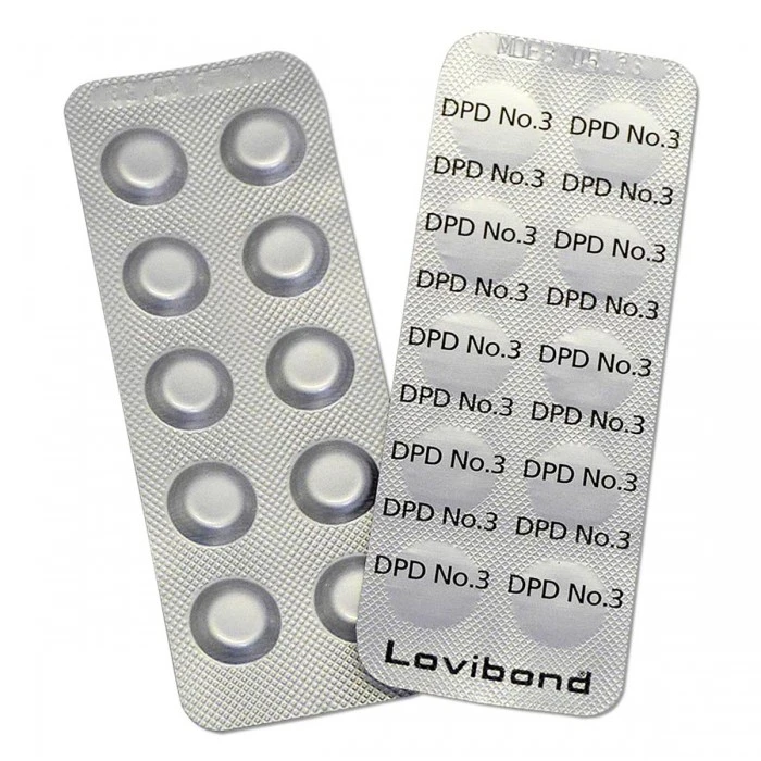 DPD №3 используется в методе DPD для определения хлора и для правильной дозировки средства по уходу за водой при помощи фотометров Lovibond (MultiDirect, CHECKIT Comparator, Comparator System 2000 и так далее). DPD №3 используется для определения уровня общего хлора. Таблетку DPD №3 добавляют в пробу воды после определения свободного хлора с помощью DPD №1. Таблетку измельчают палочкой-мешалкой и перемешивают вихревым движением. Теперь значение можно измерить. Если из этого значения вычесть значение свободного хлора, то получится содержание связанного хлора. С помощью DPD №3 также можно определять бром, озон и монохлорамин-дихлорамин.