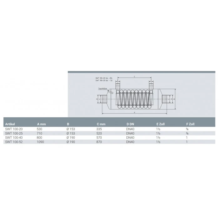 Теплообменник Behncke SWT 100-52, 52 кВт (1½"-1") - для пресной воды и низкотемпературных систем. Предназначен для нагрева воды в бассейне путем подключения к солнечной системе, тепловому насосу или низкотемпературной системе отопления. Корпус теплообменника выполнен из нержавеющей стали марки AISI 316, имеет гнездо для установки электронного температурного датчика. Поставляется в комплекте с электромагнитным вентилем.