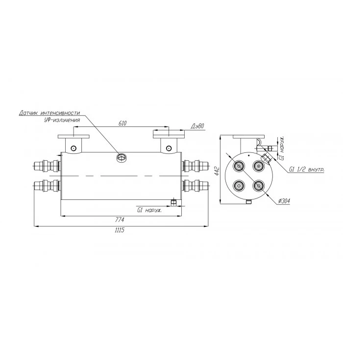 Производительность указана с учетом спада интенсивности излучения УФ-ламп в конце срока службы, а также коэффициента, учитывающего загрязнение кварцевых чехлов в процессе эксплуатации.