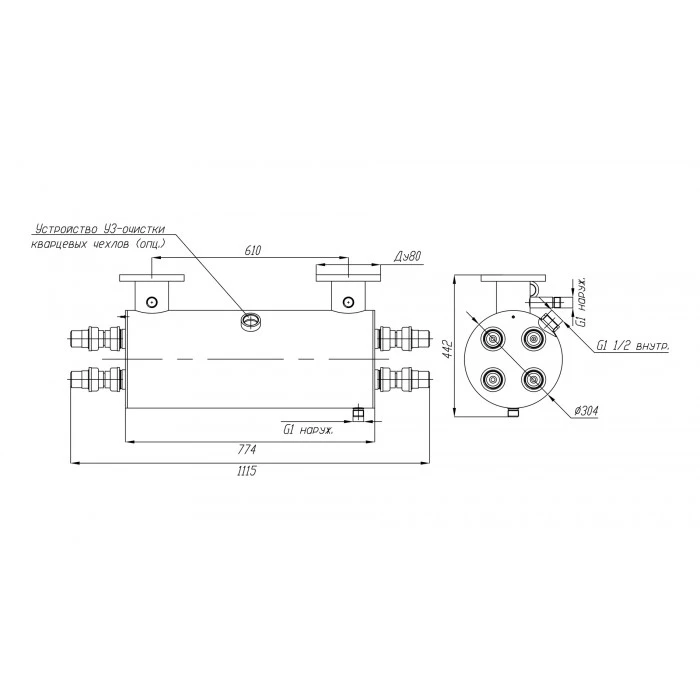 габаритные размеры камеры обеззараживания: D307 х 778 мм;