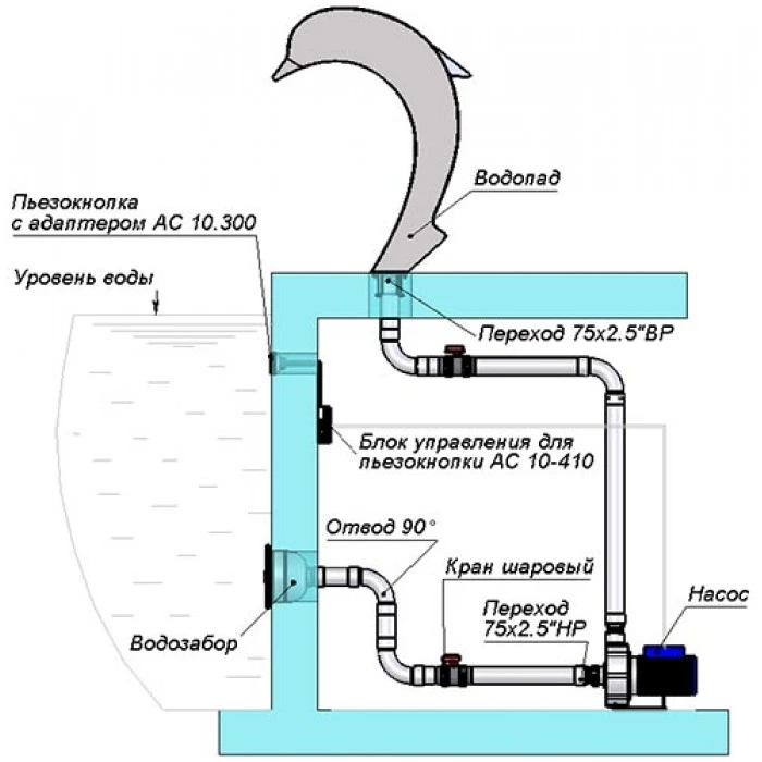 Водопад, выполненный из нержавеющей полированной стали AISI 316, является декоративным элементом. Вода с помощью насоса забирается из бассейна, далее подается по трубам на водопад и через сопло, где создается поток и достигается большой напор струи.
