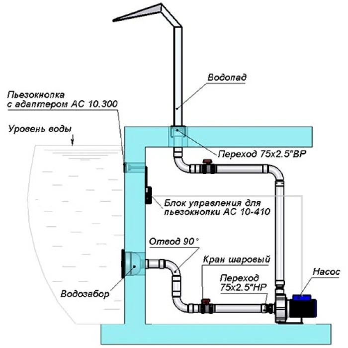 Принцип действия водопада заключается в нагнетании воды насосом по напорному трубопроводу в форсунку водопада, откуда происходит истекание воды сплошной «зеркальной стеной» в чашу бассейна.