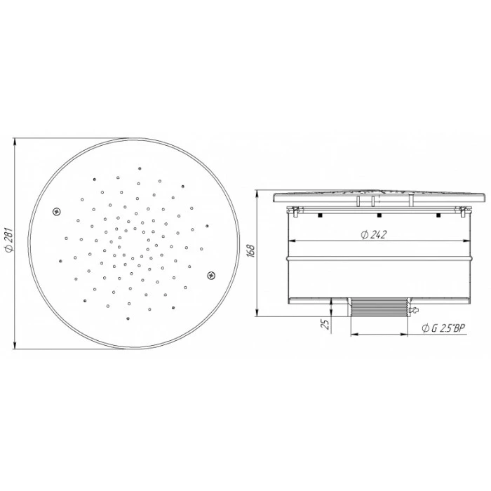 Присоединение - внутреняя резьба 2,5". Водозабор комплектуется прижимным фланцем, уплотняющей прокладкой и винтами. Антивихревая крышка препятствует образованию воронки.