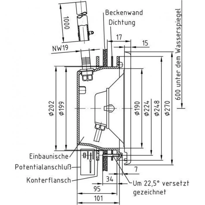 Закладная ниша прожекторов VitaLight (Hugo Lahme) 270 мм сборных бассейнов, со шлангом для кабеля и контрафланцем.